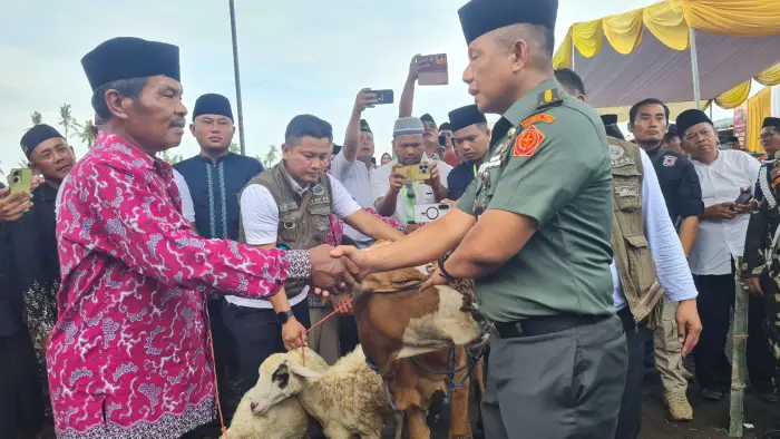 Kolonel Czi Tajuddin, mewakili Kementerian Pertahanan, membagikan secara simbolis, bantuan hewan ternak sapi dan kambing. Total ada 1004 buruh tani yang masing-masing mendapatkan satu ekor sapi dan sepasang kambing.