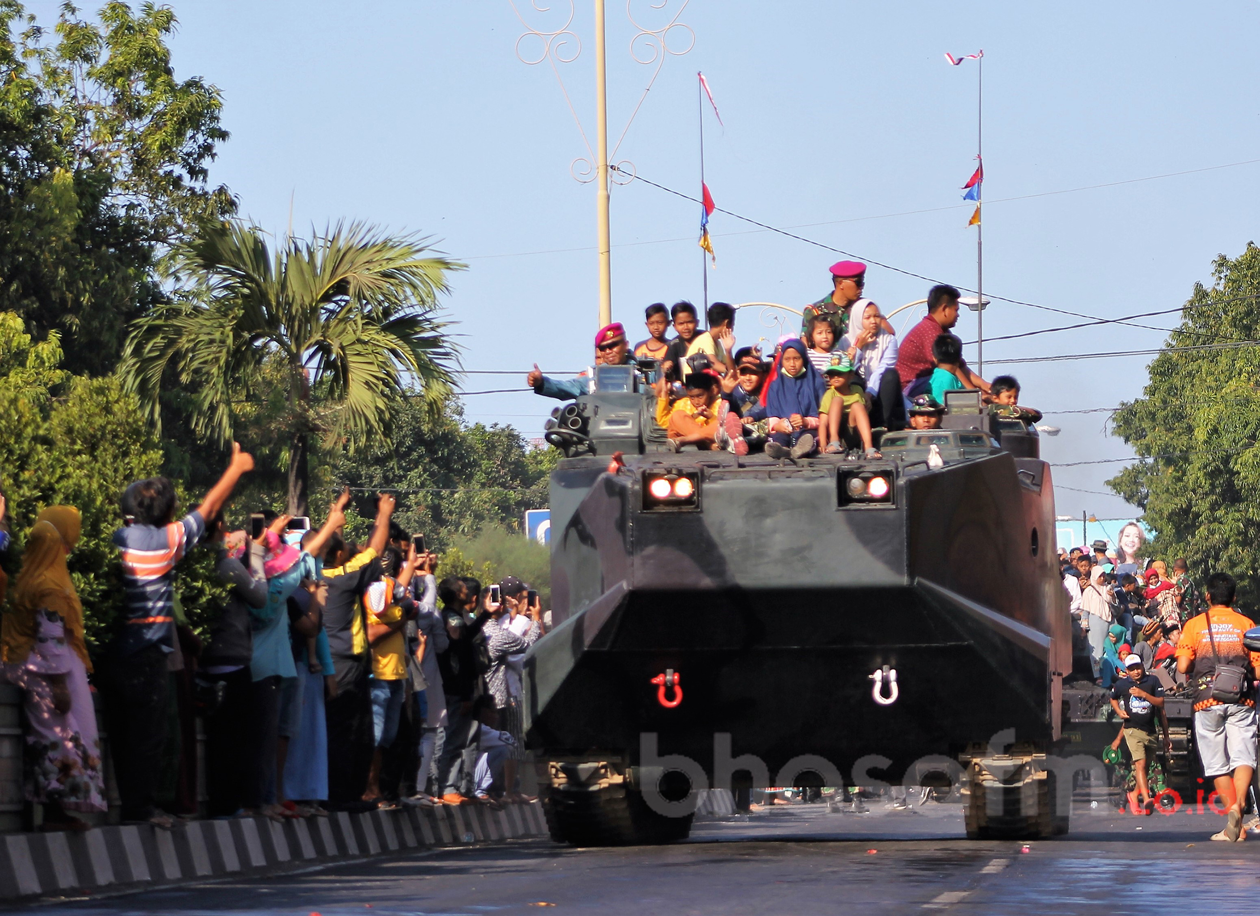 Situbondo- Parade alusista Tentara Nasional Indonesia (TNI) disambut ribuan warga Situbondo, Jumat sore kemarin. Mereka antusias menunggu di sepanjang jalan untuk melihat dari dekat peralatan tempur milik TNI.